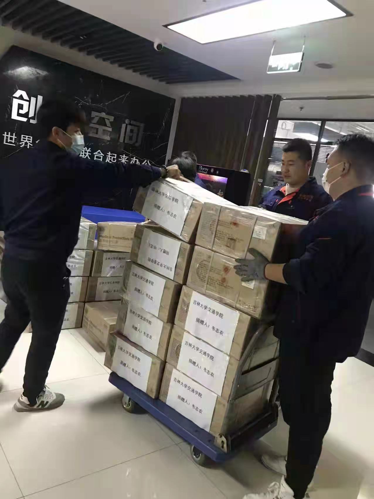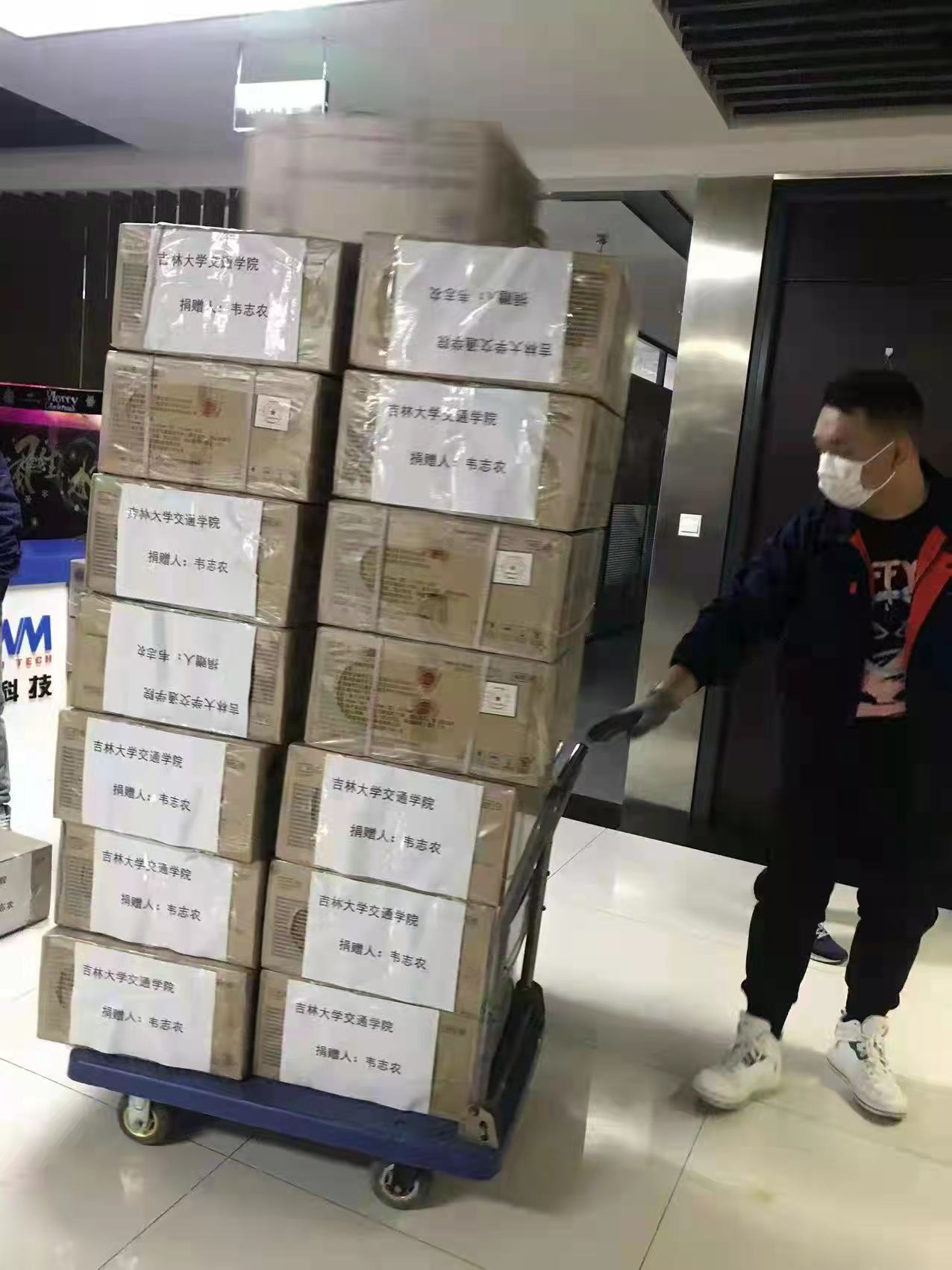 深圳市员工87届毕业生韦志农先生捐赠医用防护服10箱,一次性医用口罩2箱,消毒湿巾4箱,卫生巾15箱,卫生纸50提,桶装方便面40箱。