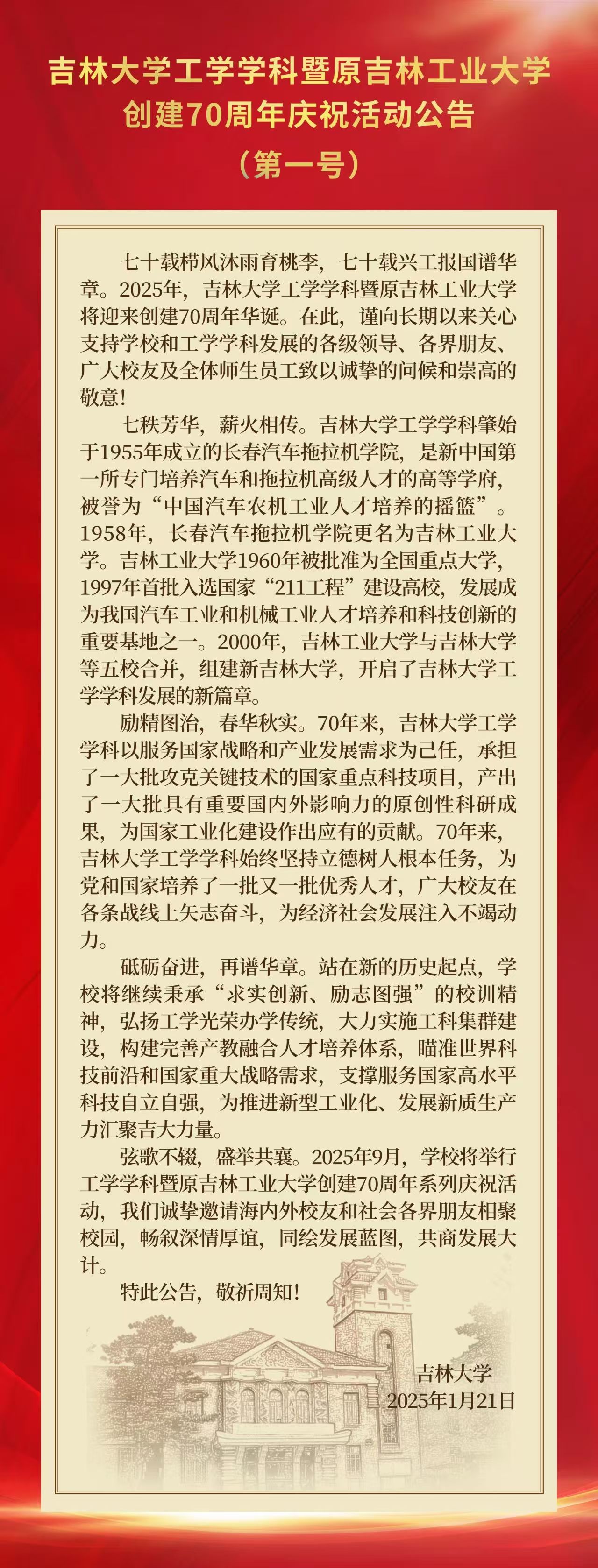 转:beats365亚洲版官网工学学科暨原吉林工业大学创建70周年庆祝活动公告(第一号)